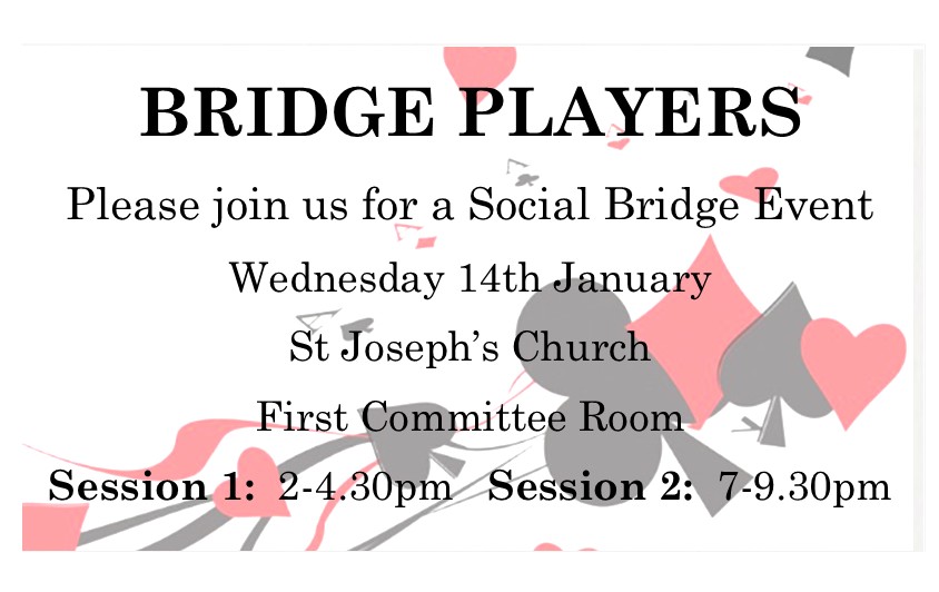 Bridge Players - you are invited to join us for bridge on Wednesday 14th January in aid of St Joseph's New Community Hall.